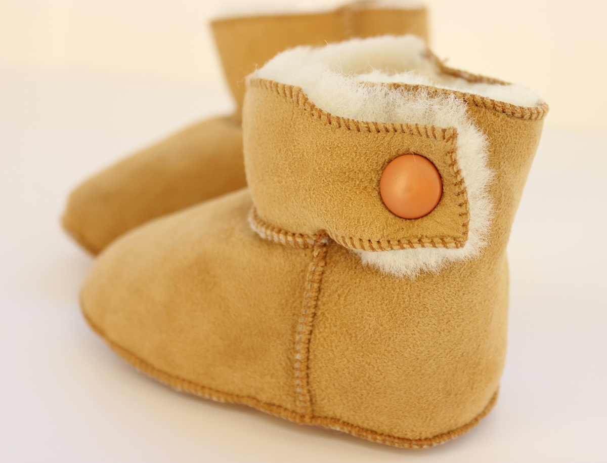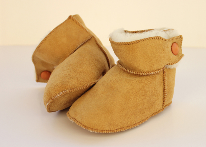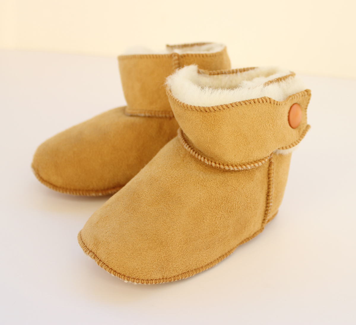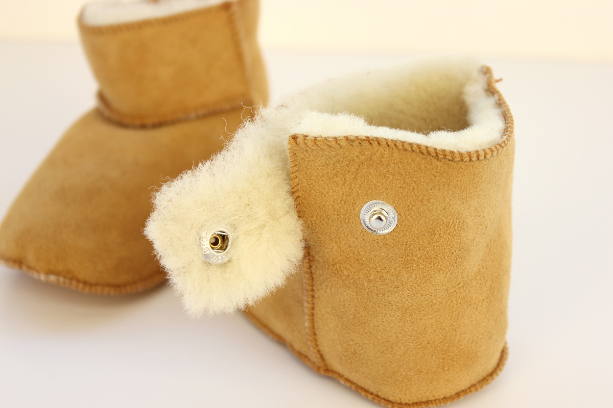Made with sheep skin suede leather and fur with a very practical button will keep your little ones warm and cozy!